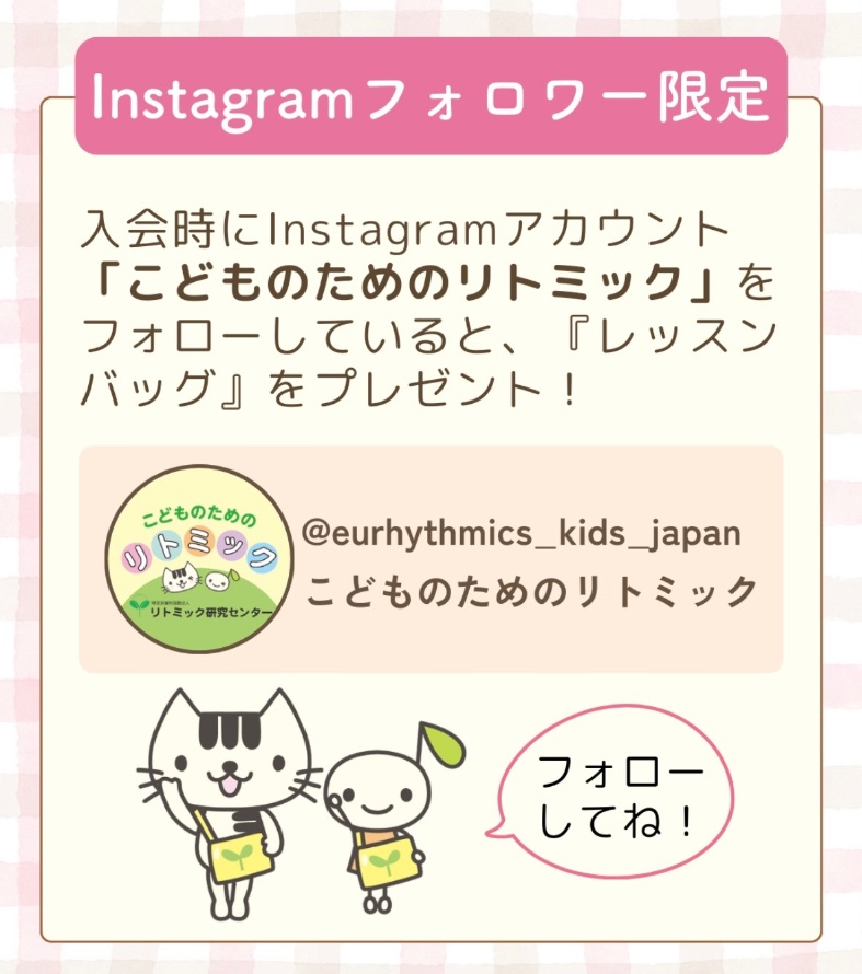 @eurhythmics_kids_japanをフォローしているとリトミック研究センターオリジナルレッスンバッグをプレゼント。